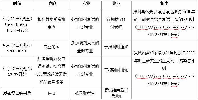 其他未尽事宜请见《betway西汉姆联官网2025年硕士研究生招生复试录取工作方案》http://yjsc.hfnu.edu.cn/info/1181/19461.htm