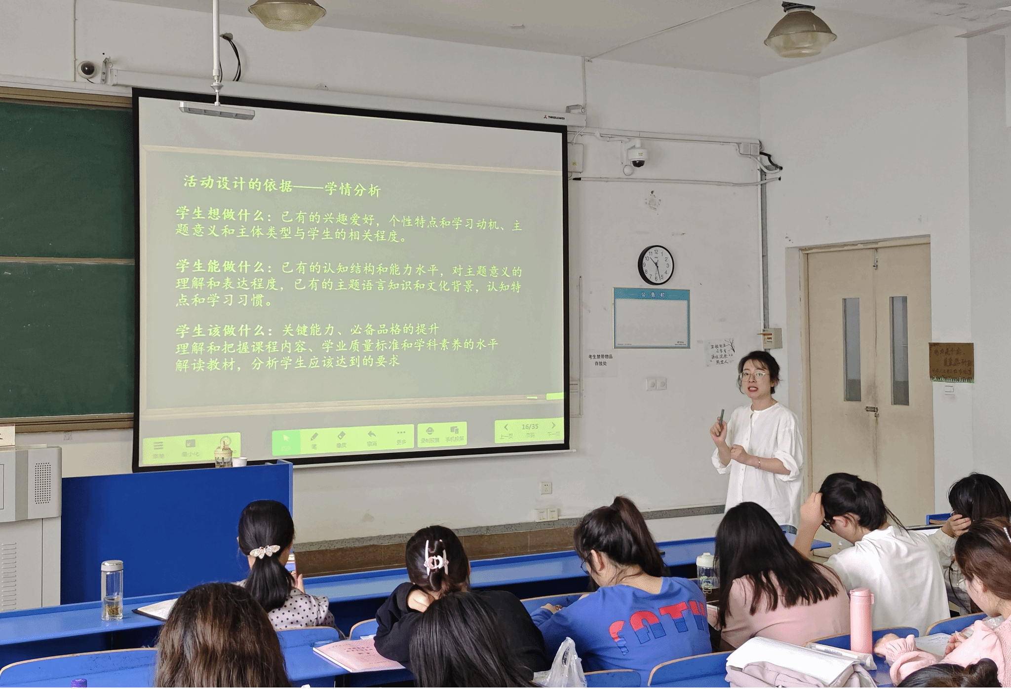 曹老师以《基于新课标的小学英语教学方法与艺术》为主题,围绕“新课标下的小学英语教学背景”“英语活动设计的理论与策略”“案例分析”三个部分进行分享。从英语教学总目标、教学内容和教学方式三个方面给大家提出了指导意见,鼓励师范生以核心素养为指引,进行主题意义探究,加强学科融合,促进学生全面发展。