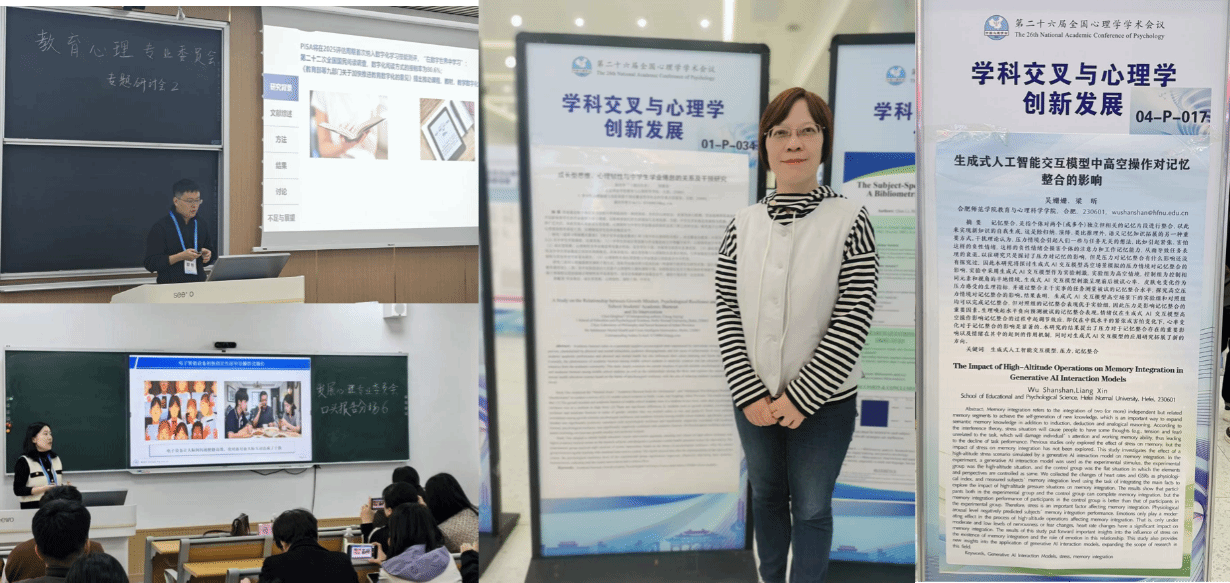 各专题交流环节中,我校教师的学术成果亮点纷呈。在“教育心理专业委员会”专题会场,郝宁作《人机共创的未来:AI创造力偏见与人-AI协同创新》报告,系统揭示人类对AI创作的心理机制及优化人机协作的路径,并提出“私人AI助理”模式显著提升团队创新表现的实证依据。陈庆华分享中学生学业倦怠的干预研究成果,提出成长型思维与心理韧性在缓解倦怠方面的重要作用,并研发可推广的心理干预方案;张晓丹围绕初中生社会比较与体像困扰,阐释了感知父母支持促进学习投入的作用机制;吴皖赣比较电子屏与纸质阅读注释策略的差异,为数字化时代的阅读教学提供科学依据。蒋柳青构建科技干扰导致大学生社交网络成瘾的理论模型,为网络使用干预提供新思路;吴姗姗利用生成式人工智能模拟高压情境,揭示压力对记忆整合的抑制机制,拓展了心理学领域AI应用的研究空间。