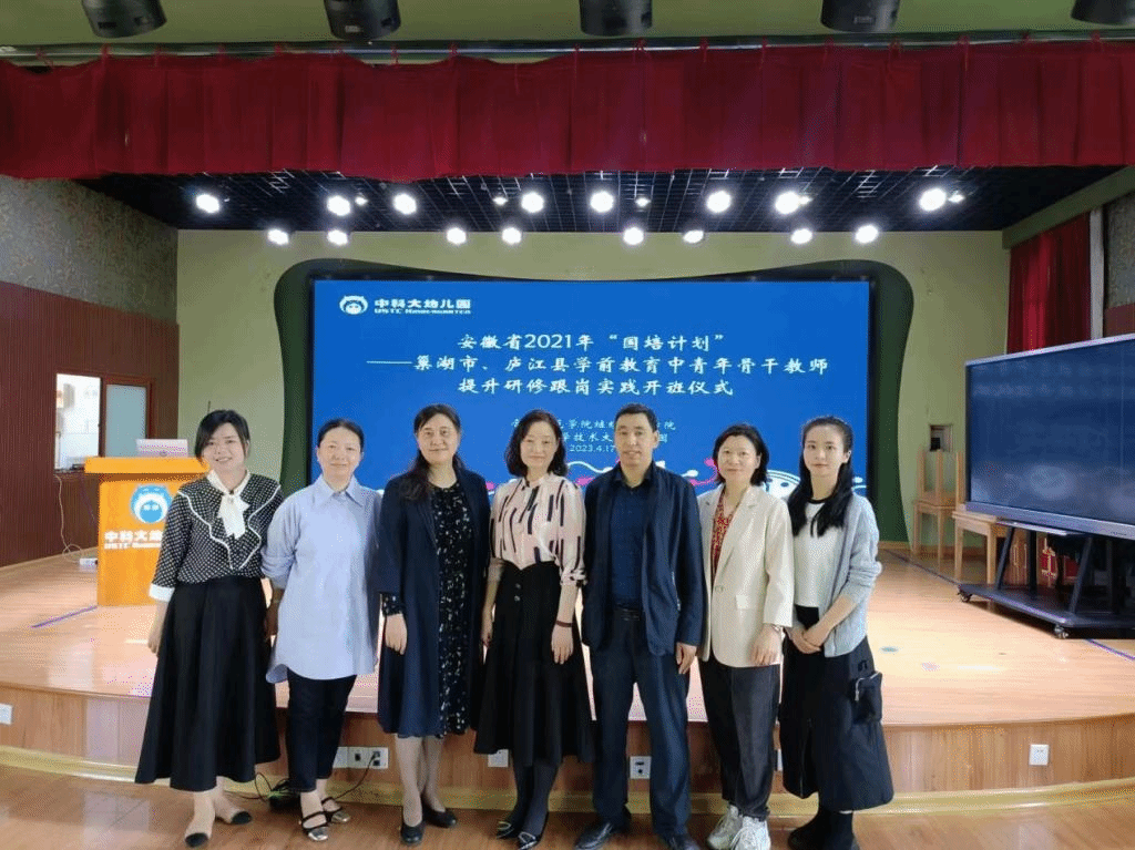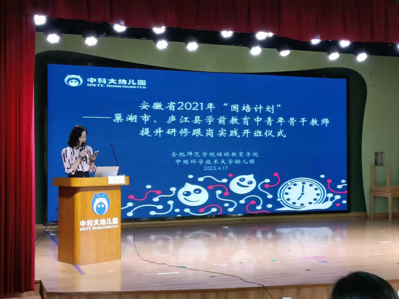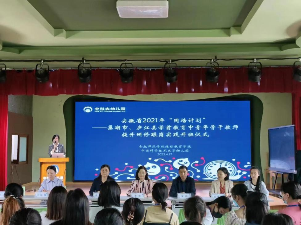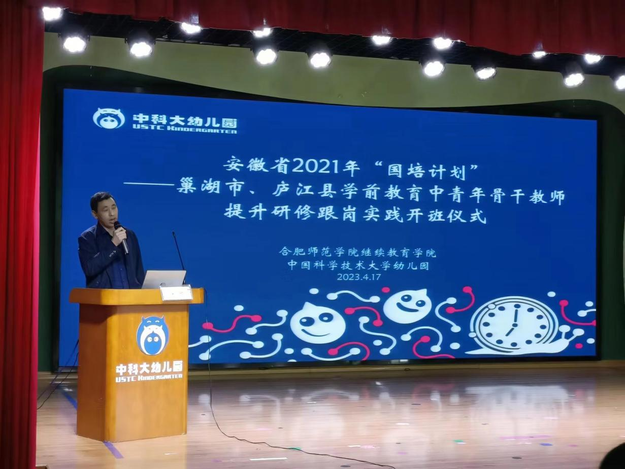 2023年4月17日上午,由betway西汉姆联官网betway西汉姆联官网承办的安徽省“国培计划(2021)”——巢湖市、庐江县学前教育中青年骨干教师提升研修跟岗实践班如期在中国科技大学附属幼儿园开班。betway西汉姆联官网betway西汉姆联官网党委书记穆娟、继续教育学院副院长宋辉、betway西汉姆联官网学前教育系吴忠霞、唐银老师,中国科技大学附属幼儿园园长袁洁、业务园长王咏梅、巢湖市、庐江市学前教育中青年骨干教师33人参加了开班仪式。仪式由中国科技大学附属幼儿园业务园长王兰兰主持。