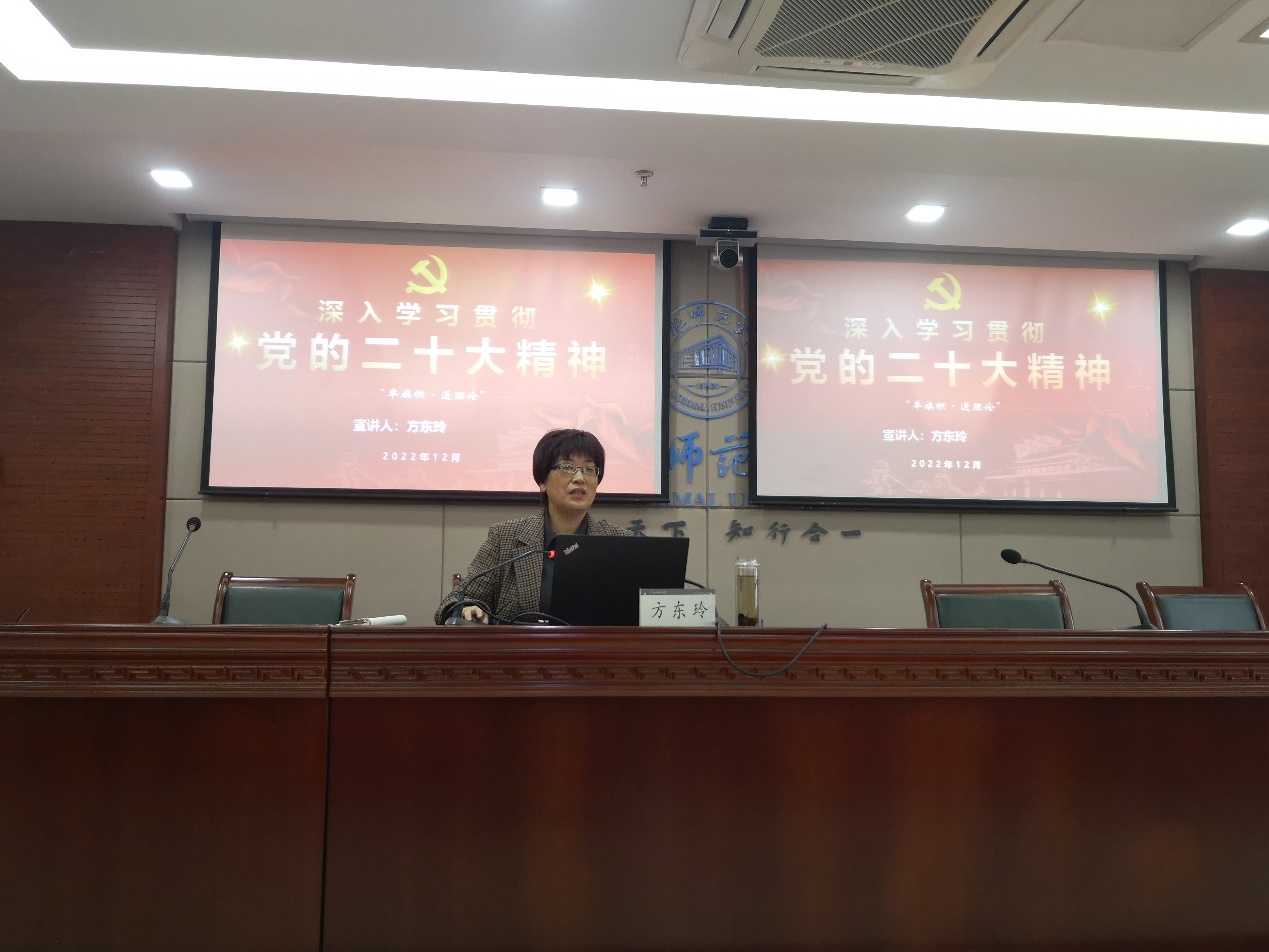 方东玲以“深入学习贯彻党的二十大精神”为题,结合自身学习体会,从党的二十大的基本情况、深刻领会党的二十大的重大意义、准确把握党的二十大精神实质、以党的二十大精神为指引,全面推进学校高质量内涵式发展等方面进行了全面、深入、系统、有针对性地宣讲。