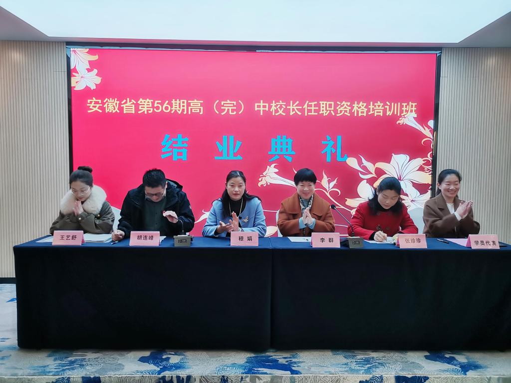2021年12月7日上午,教师教育学院承办的安徽省第56期高(完)中校长任职资格班在合肥市曼斯顿酒店举行了结业典礼。教师教育学院党委书记穆娟、院长李群、干训部主任胡连峰、班主任张珍珍,学生助理王艺舒以及来自全省各地73位校长班全体学员参加了结业典礼,典礼由胡连峰主持。