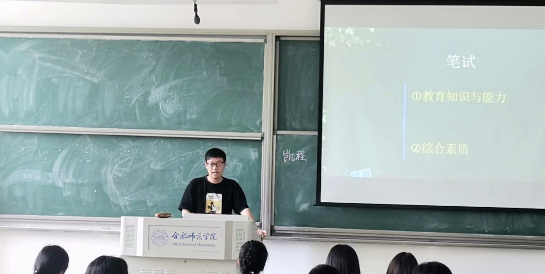 黄贤程是2019-2020学年国家奖学金获得者。黄贤程针对小学教师资格证考试分享了自己的应试经验,他向同学们详细介绍了笔试复习内容和面试的流程。随后,他简单介绍了自己获得国家奖学金的心路历程,并对在座的学弟学妹提出建议,在校期间要认真学习专业知识,通过社会实践等多种途径充实自己,积极参加师范生技能大赛等竞赛,在参赛过程中不断提升自己。