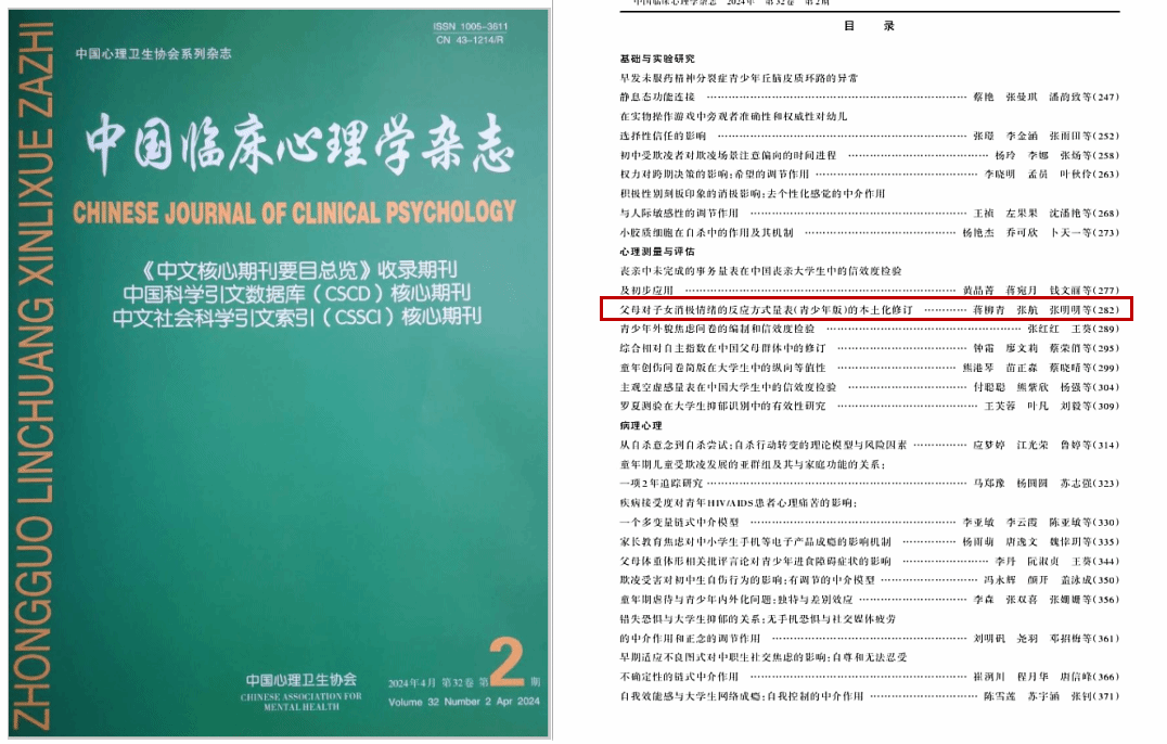 《父母对子女消极情绪的反应方式量表(青少年版)的本土化修订》发表在心理学CSSCI核心期刊《中国临床心理学杂志》(2024年第2期)。betway西汉姆联官网betway西汉姆联官网为论文的第一单位,该研究工作得到青少年心理健康与危机智能干预安徽省哲学社会科学重点实验室开放课题重点项目的资助。(betway西汉姆联官网)