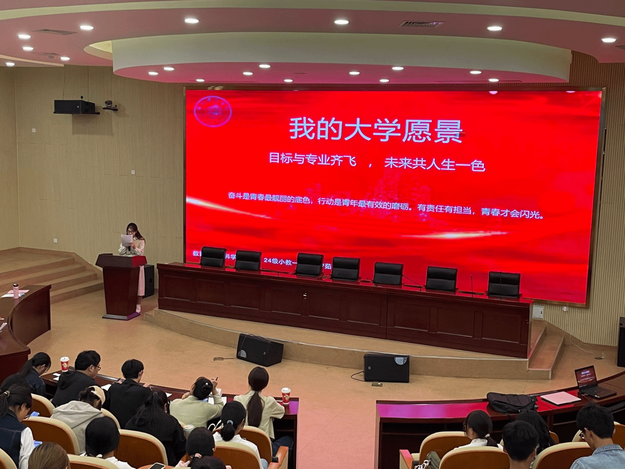 通过层层选拔,11位参赛选手进入决赛。比赛中,教院新生们结合自身实际和入学以来的所思所学所感,畅谈了学习生活的阶段目标、职业规划设计等大学愿景。张辰玥同学这样说到:“坚定理想信念,扎实学识基础,锻炼健康体魄,培养良好习惯,不断突破自我,打破舒适圈,为梦想不停歇脚步!”朱梦圆同学则表示,要坚定理想信念,不断完善自我,争取能够成长为一名光荣的大学生党员。张潘同学希望通过自己四年的不懈努力,夯实专业知识技能,涵养教育家精神,不断提高综合素养,为将来的教师职业奠定扎实基础。