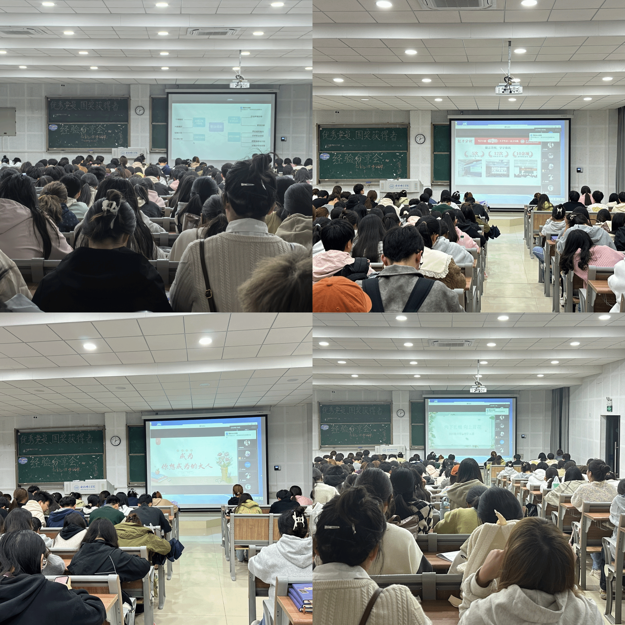 郭芷妍以“做好职业规划,开启大学生活”为主题,从自我认知与定位、环境与职业分析、计划与实施、评估与调整四个方面分享了自己的职业规划,并建议新生们要尽早做规划,明确自己的目标和方向,有针对性地选择实习单位和就业岗位。杨思琪以“等风来不如追风去”为题,分享了自己在参加各类创新创业比赛的点点滴滴,指出通过参与各类竞赛活动不仅能够强化个人专业素养,更可以开阔眼界、提升综合能力,她鼓励新生要勇于创新和挑战自我。王欣以获得国家奖学金为切入点,激励新生们要不断提高学习能力和信息检索能力,积极在各类社团活动中拓宽视野,促进自己成长成才。石嘉以“向下扎根,向上开花”为题,结合自身经历讲述了自己在大学生活中如何一步步向党组织靠拢,分享了在这个过程中的感悟与收获,让在场的同学们感受到了思想引领的力量。
