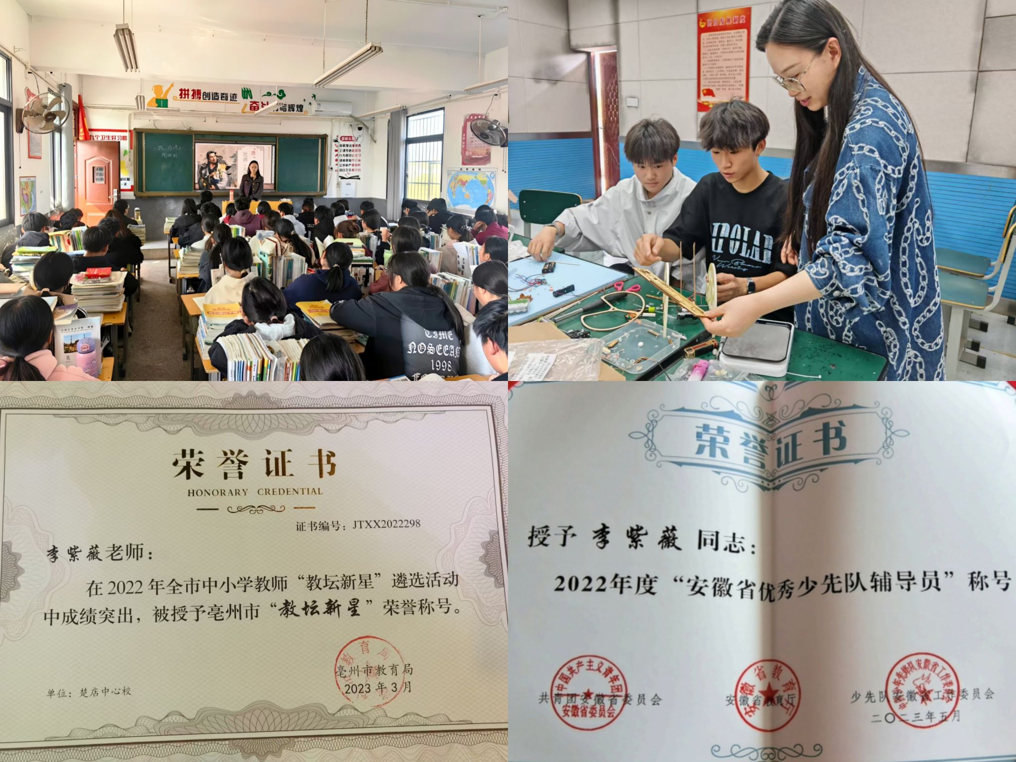 2022年,我凭借着大学的专业基础以及工作的经验积累,荣获“亳州市教坛新星”称号。2024年,我在专业领域上不断精进,在亳州市初中语文“优质课大赛”上名列二等奖第一名。2025年,我指导学生在全国第十一届青年科普创新实验暨作品大赛“未来太空车项目”崭露头角,获得亳州市一等奖,最终荣获安徽省三等奖,我个人也荣获“安徽省优秀少先队辅导员”称号。